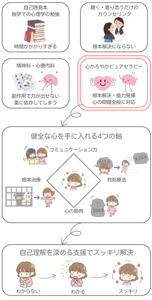 当ルームでは、安定した自己肯定感を育てるための実践的な方法や、心の深い部分に働きかける各種セラピーを組み合わせて行っています。