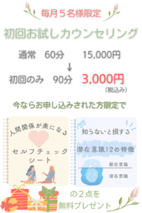 当ルームでは、安定した自己肯定感を育てるための実践的な方法や、心の深い部分に働きかける各種セラピーを組み合わせて行っています。